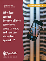 This unit on contact forces begins as students consider situations in which they have seen their phones break. They contrast these situations with others where something else collided with another object and either broke or, surprisingly, did not. Attempting to identify the factors that contribute to damage occurring in some collisions and not others, as well as trying to explain what is happening during the collision that causes one type of result versus another, sparks a series of questions and ideas for investigations around the question why do things sometimes get damaged when they hit each other? This drives the work for the first two-thirds of the unit, with the second third layering on the problem of measuring forces in collisions. The last third of the unit re-anchors around a related question and a design problem that invites students to design sensor systems or other solutions to measure forces as a way to minimize damage from collisions or solve related problems.